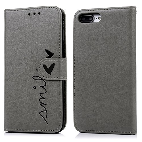 iPhone 7 Plus Case Leather Wallet Embossed Smile Love Design PU Leather Flip Case Detachable TPU Cover Magnetic Wallet with Card Slots & Wrist Strap Case for iPhone 7 Plus 5.5 inch - Gray.