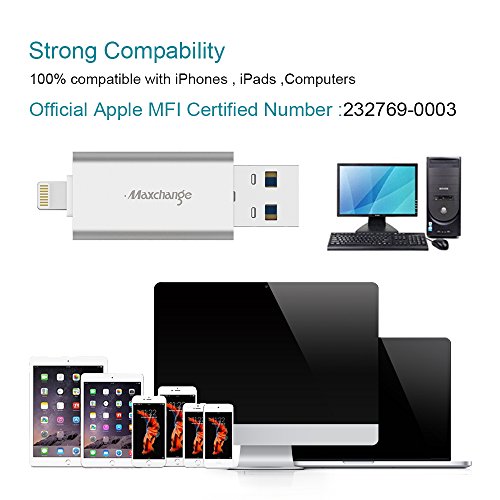 Maxchange Memory Stick 32GB USB 3.0 iPhone Flash Drive for iPhone iPad PC with Extended Lightning Connector External Storage Memory Expansion with Detachable Micro USB Adaptor for Most Android Phones. Maxchange Flash Drive, USB 3.0 pen drive with Lightning Connector for iPhone, iPad, Macs
